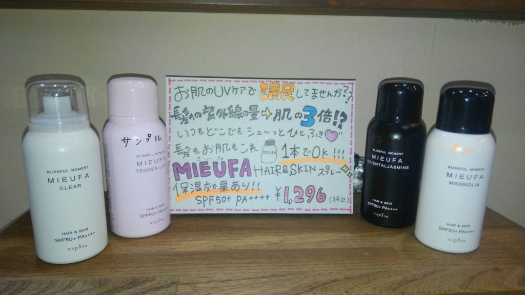 今が旬な商品としましては「ミーファフレグランスUVスプレー」であります。